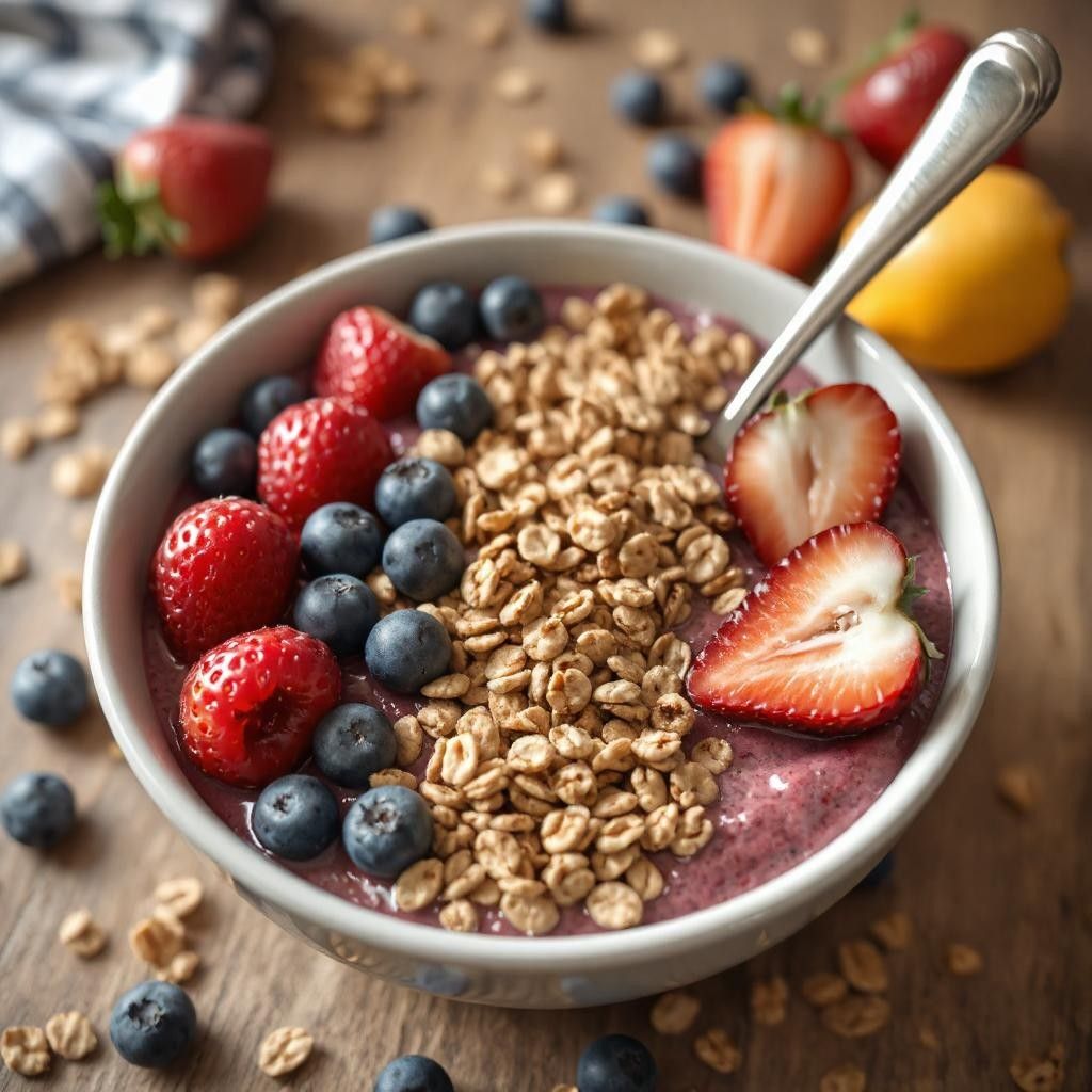 – Dans un blender, mélangez les fraises, les myrtilles, la banane, et le lait végétal (ou yaourt) jusqu’à obtenir une texture crémeuse et épaisse